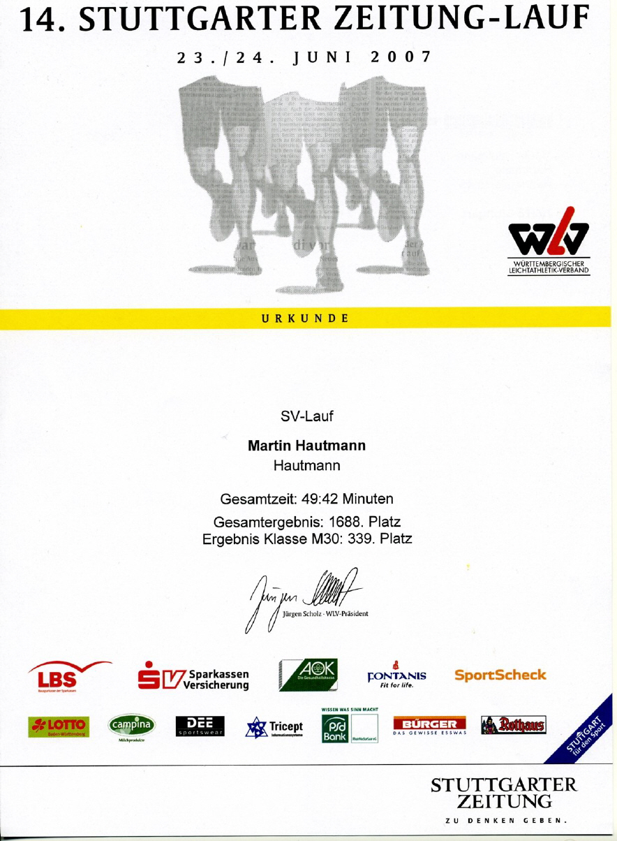 Teilnahme am SV - Lauf über 7 km am 24.06.2007 Zeit 49,42 min