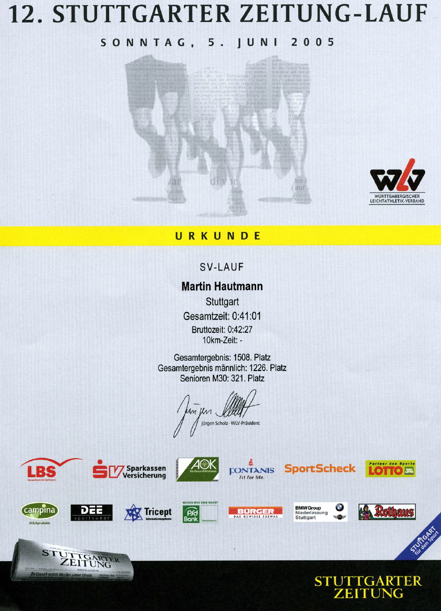 Teilnahme am SV - Lauf über 7 km am 05.06.2005 Zeit 41,01 min