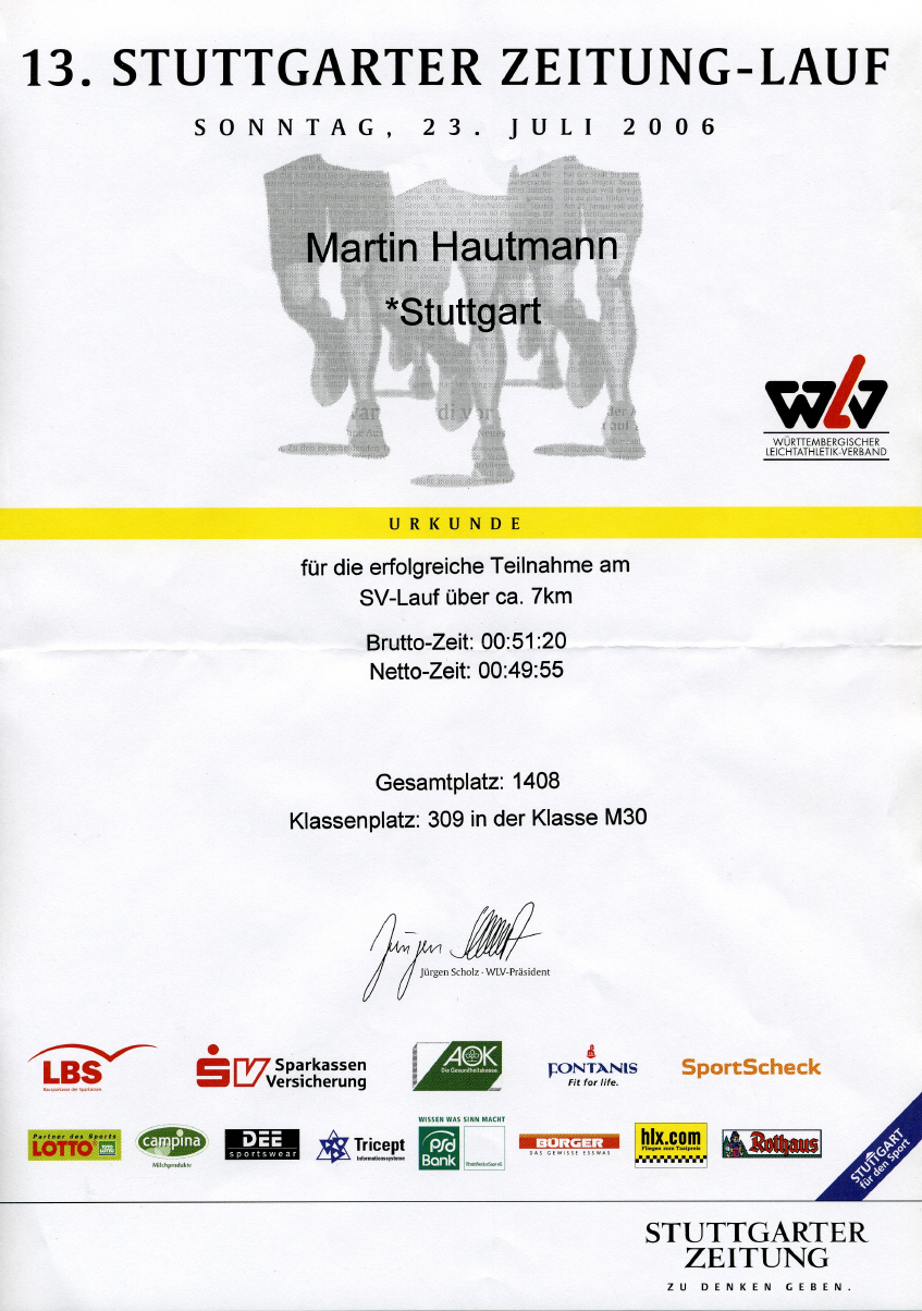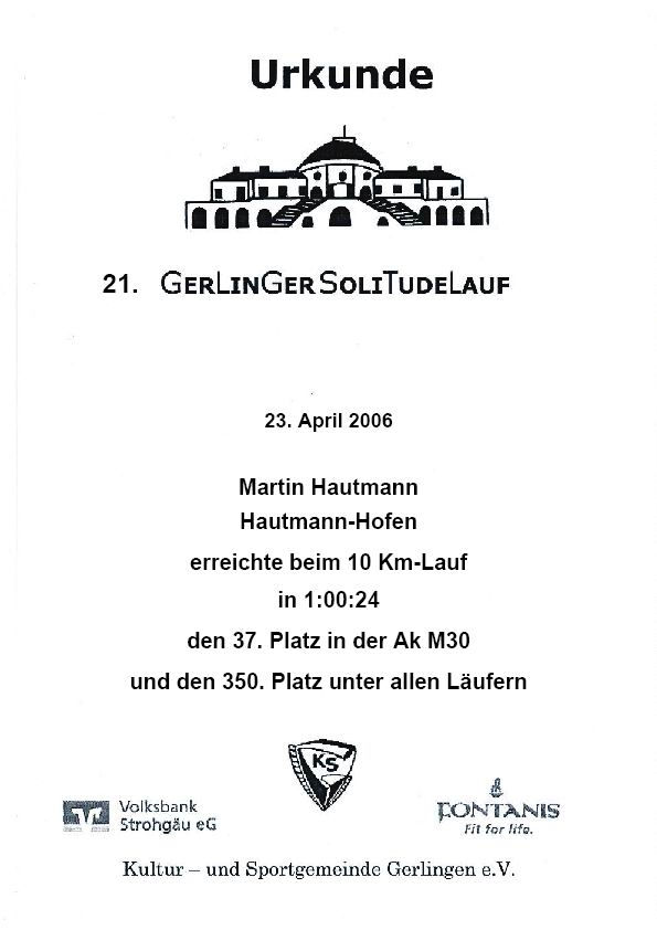 Teilnahme am Solitudelauf über 10 km am 23.04.2006 in 1.00,24 min