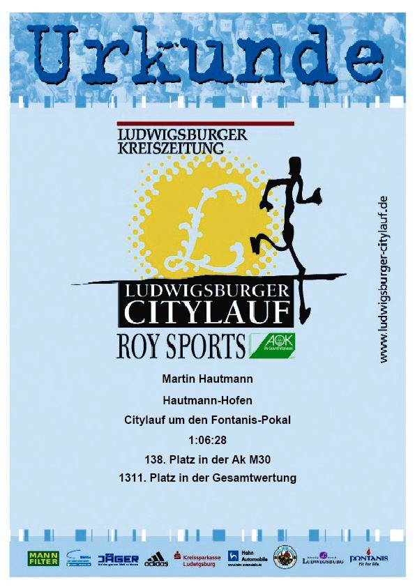 Teilnahme am Ludwigsburger Citylauf über 10 km in 1.06,28 min